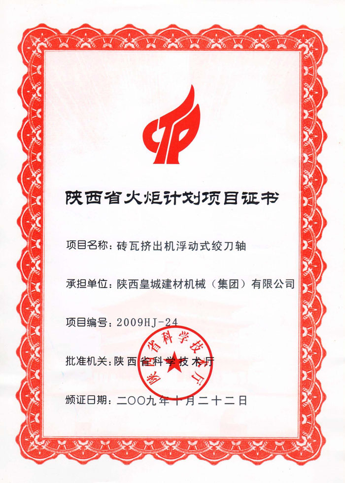 陜西省火炬計劃項目證書